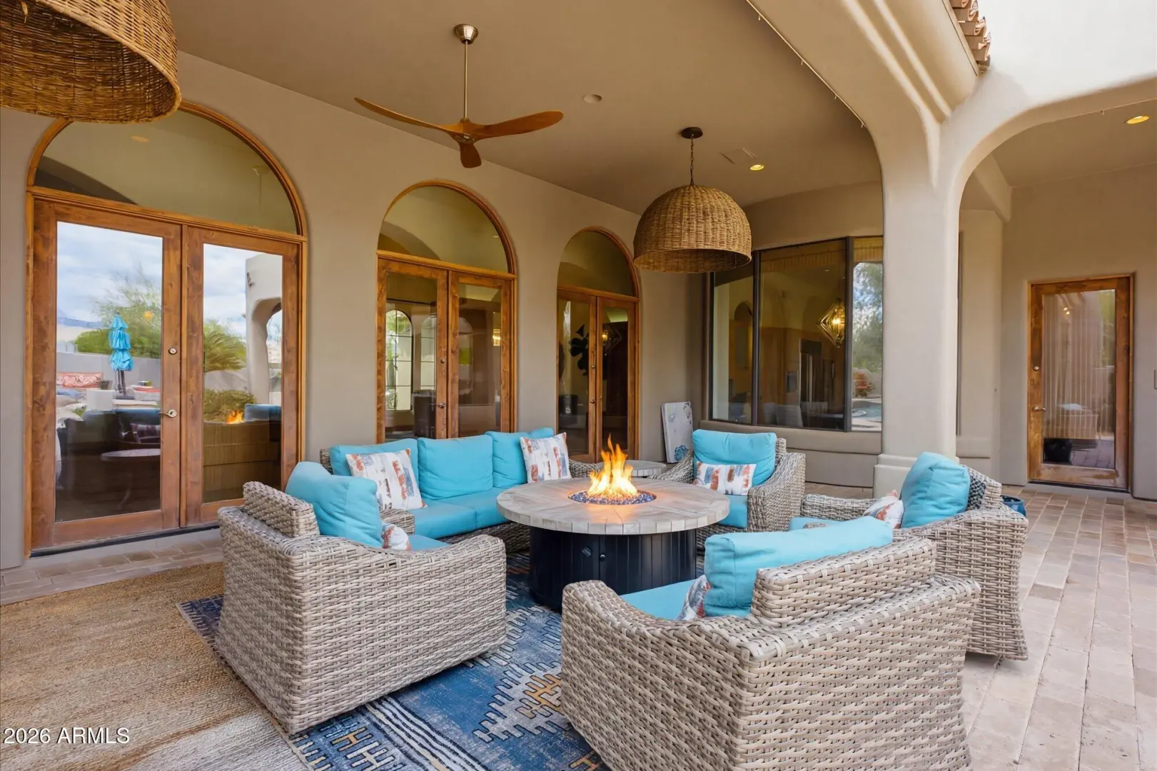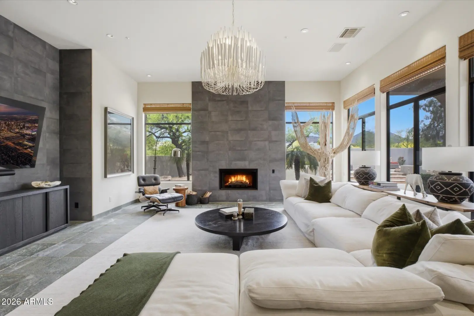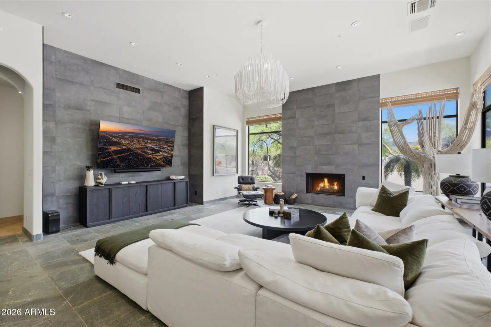 Experience this stunning, single-level home located w/in the gated community of Los Diamantes. Offering 5 beds & 5 baths, this home radiates warmth w a contemporary flair. The office has a separate entrance w its own en-suite bath which provides flexibility as a fifth bedroom, guest quarters, or private workspace. The primary suite is a true retreat, featuring a completely remodeled bathroom, dual walk-in closets, & private sitting room complete w fireplace & electric blinds that open to million-$ views of the McDowell Mtns. Three additional en-suite bedrooms, each w walk-in closets, provide space & privacy for family or guests. At the center of the home a large great room is open to a clean-lined chef's kitchen-ideal for gathering and entertaining. Enjoy Arizona's indoor/outdoor lifestyle