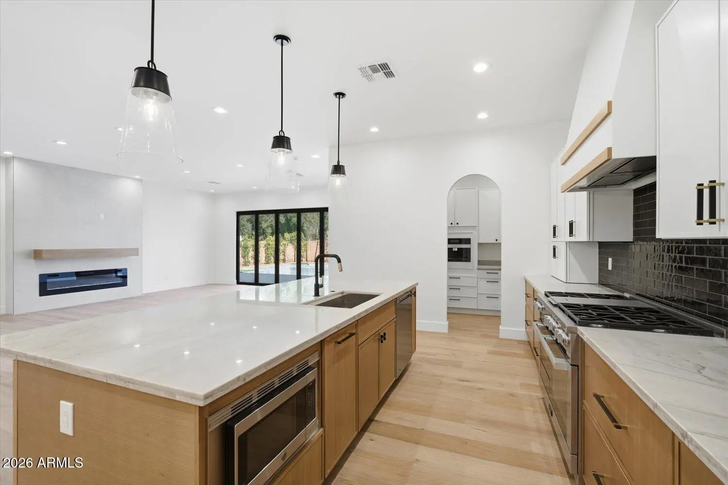 Intentionally reconstructed and reimagined with elevated design and thoughtful functionality, this home blends the feel of new construction with timeless Arcadia Lite charm. Enjoy high ceilings, a split-living floor plan, a privately positioned primary retreat, and a rare all-ensuite bedroom layout. The open living area features wide-plank white oak flooring, a statement fireplace, and multi-panel sliding doors that open to a new resort-style pool and expansive covered patio for indoor-outdoor living. The stunning kitchen showcases detailed finishes, Miele appliances, and a butler's pantry complete with a built-in Miele coffee system and wine fridge. The private primary wing offers a dry bar & an attached pocket office with private entrance. NEW HVAC, ELECTRICAL, PLUMBING & ROOF.