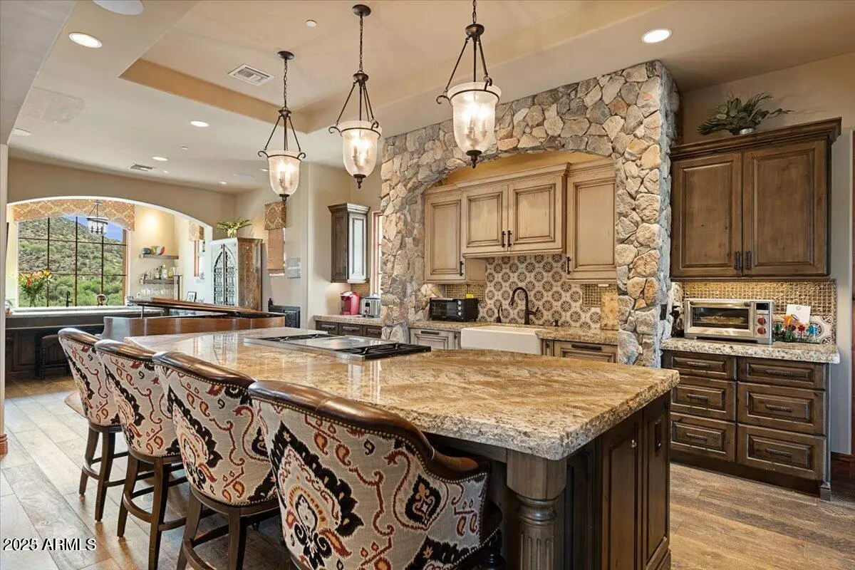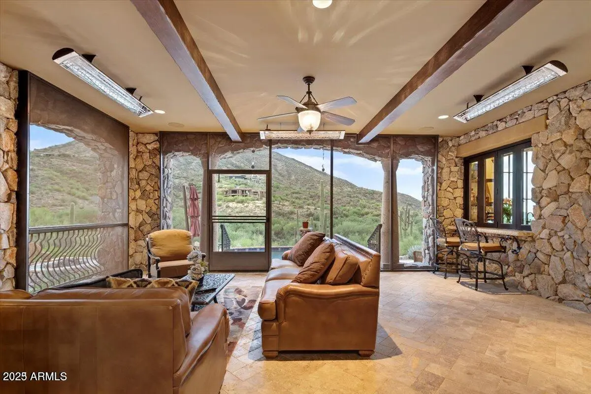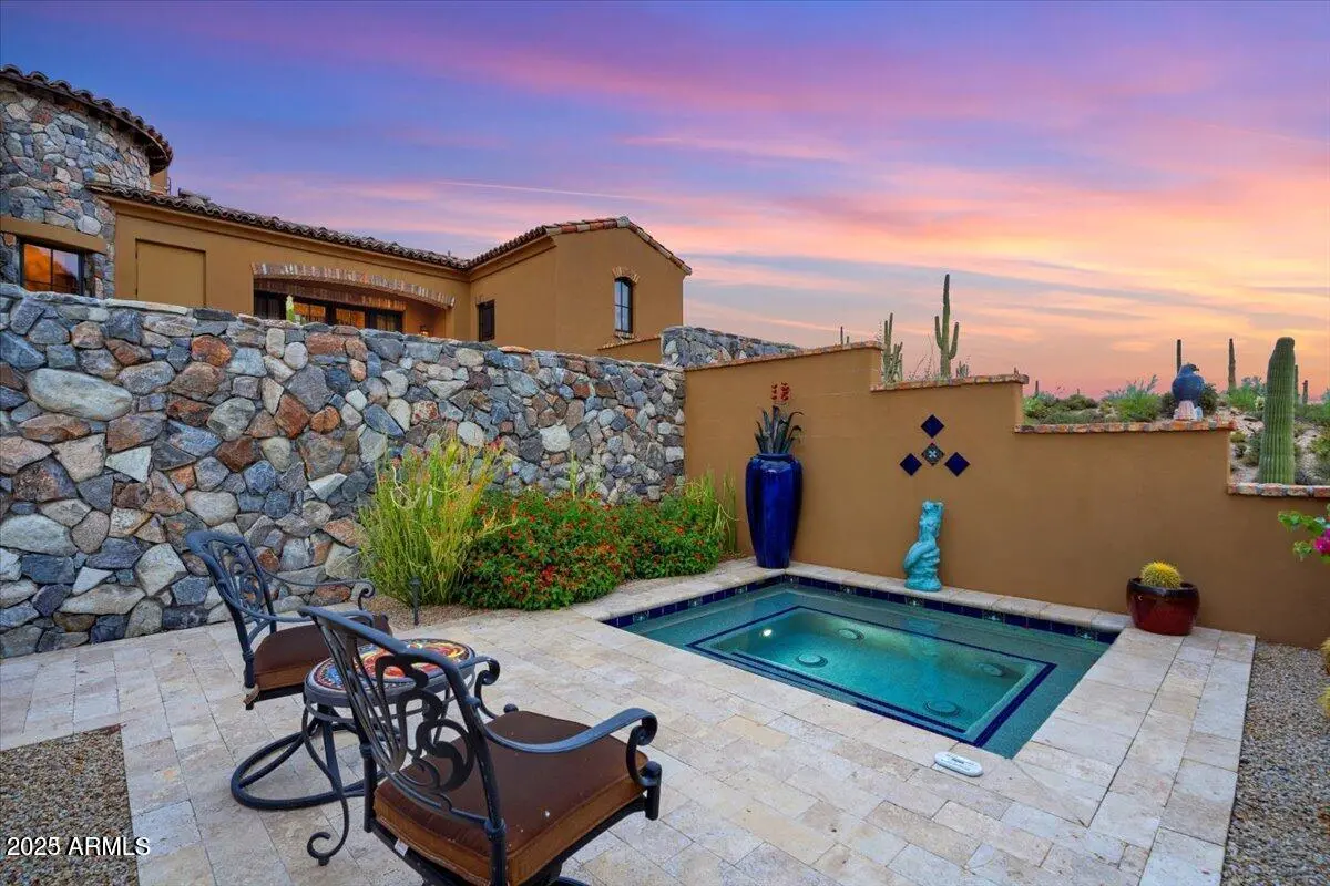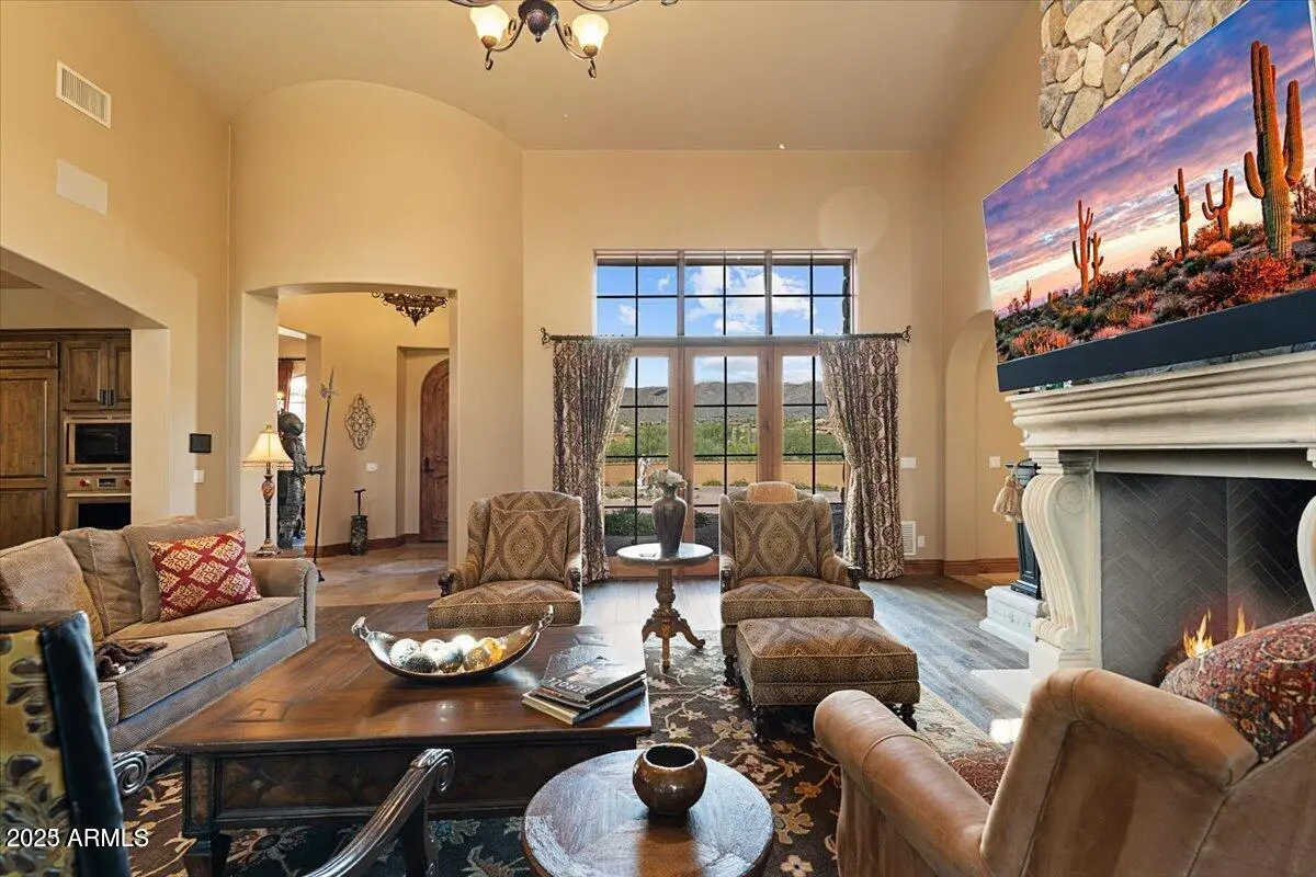LIFESTYLE MEMBERSHIP AVAILABLE. Exquisite 2.2 acre Desert Mountain estate welcomes you with its brick lined circular driveway, old world feel and panoramic mountain views that do not stop! Elegance abounds with the extensive use of marble and stone finishes throughout, granite countertops, gorgeous tile flooring and well appointed bathrooms! The kitchen is an absolute DREAM and features a gas cooktop, double wall ovens and a wet bar with a pass through to one of the FIVE outdoor patios (one is screened in)! There are 3 bedrooms with ensuite baths in the main home, with a bedroom, bath and kitchen in the private 545 sq. ft. casita with separate entrance! Let the views of the Sonoran desert and stunning sunsets melt away your stress while soaking in the sparkling pool or spa!